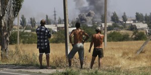 Un résident regarde de la fumée s’élever lors de bombardements, dans la ville de Novoazovsk, est de l’Ukraine, le mercredi 27 août 2014.